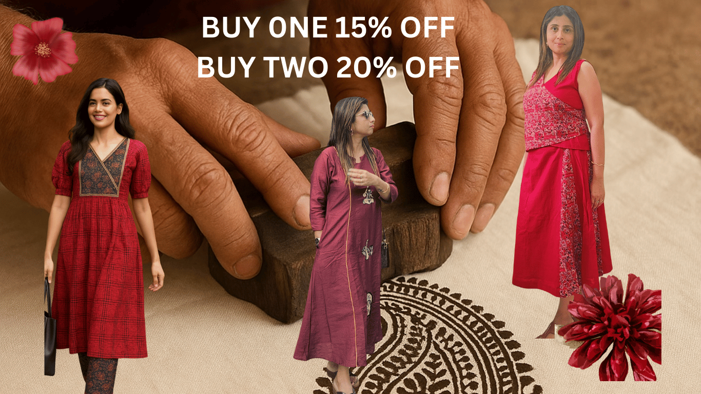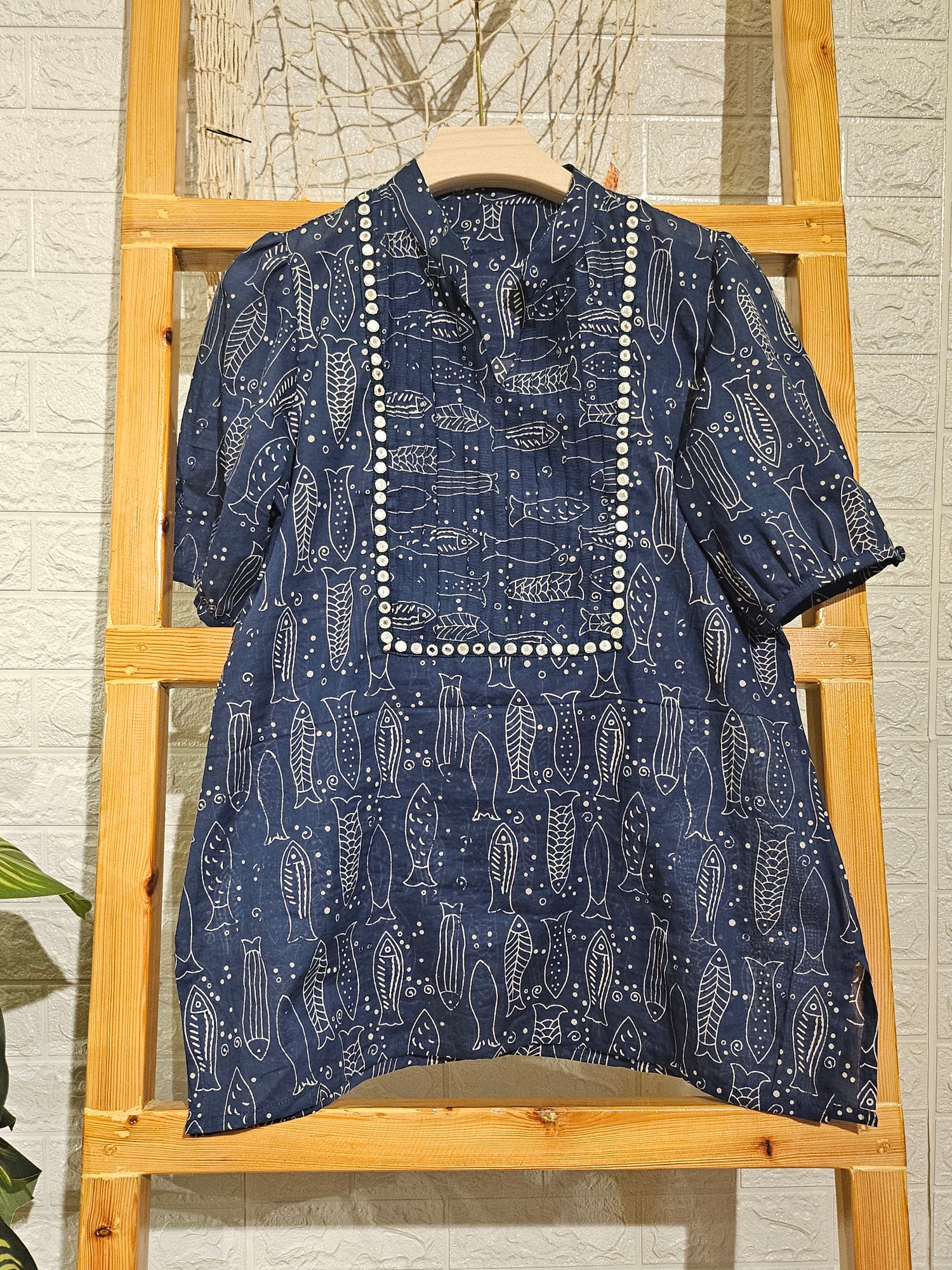 Elevate your wadrobe with this stunning mulcotton kurti.Crafted from high quality fabric,handblockprint done by our artisans along with beautiful mirror work.