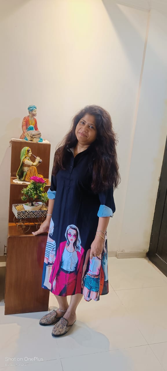 Hi,I am wearing a fun shirt dress today,with plain white skirt border, printed with animated digital girls give me a bold look.As fabric says it's super comfy and artsy. Thanks drapesoft for such a lovely fusion. Looking forward to see many more.......