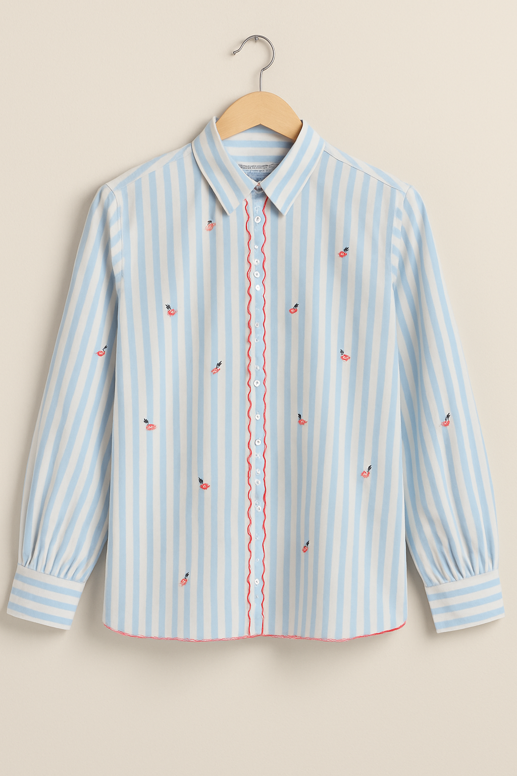 This shirt is crafted from high-quality fabric ensuring comfort and durability. Breathable cotton with a playful pink scallop piping adds flair with a curvy twist.
