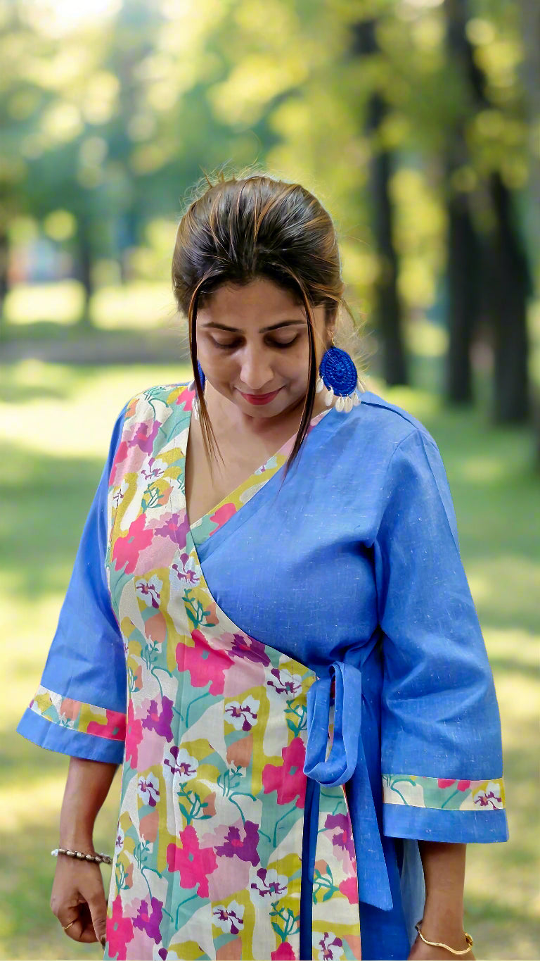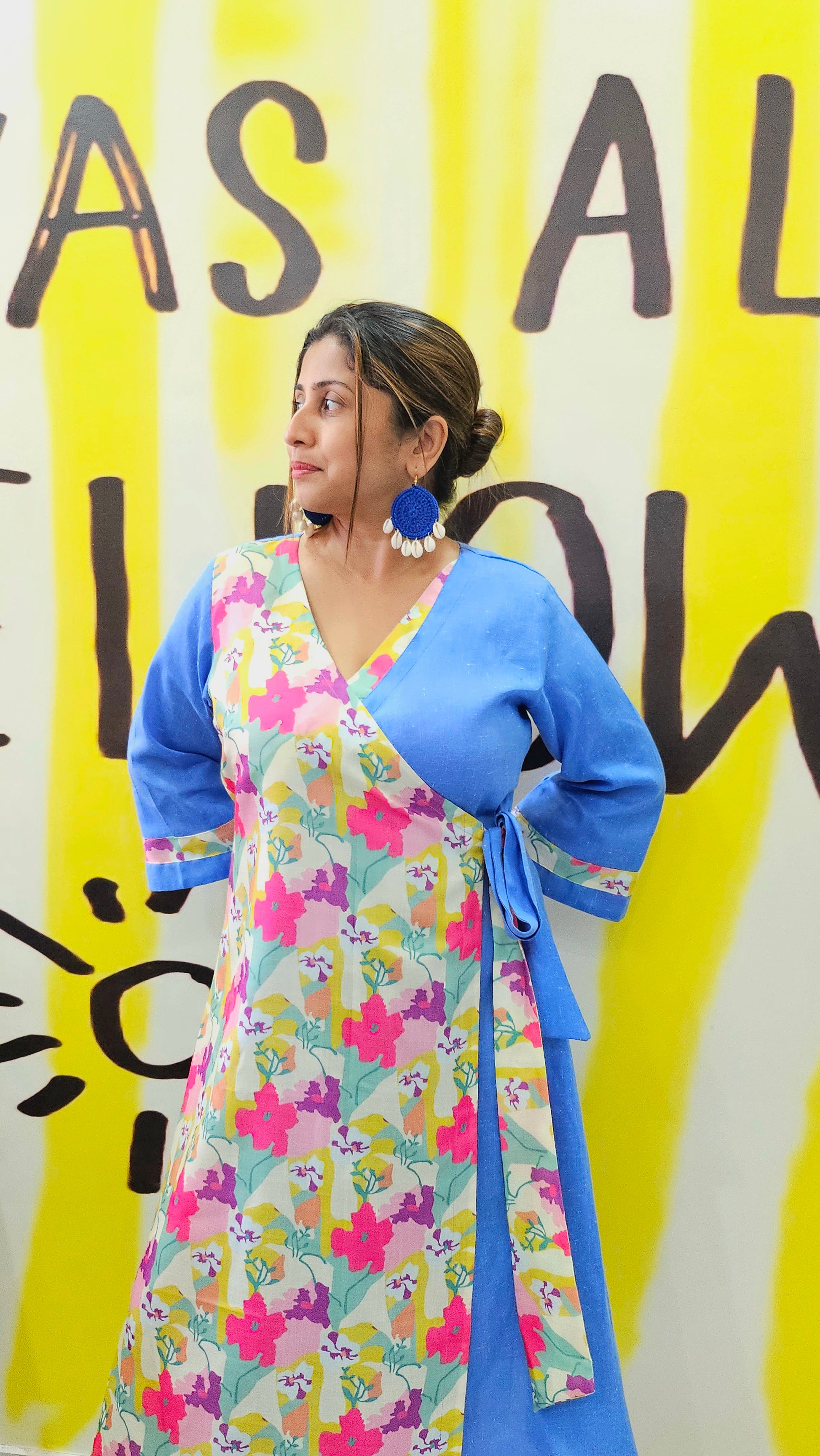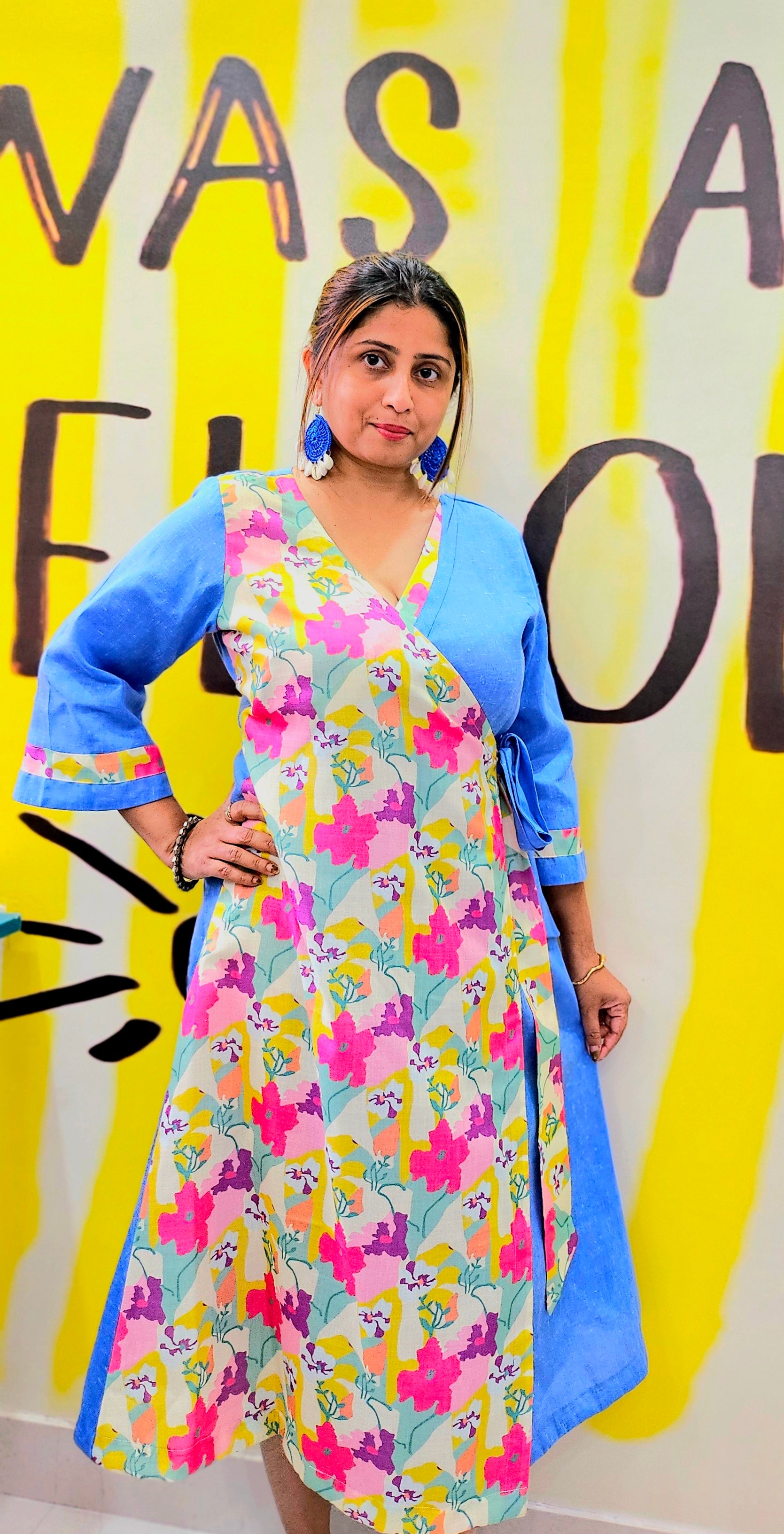 This wrap dress is made from cotton linen fabric which gives you a comfort and confident look.The silhouette is free flowing which you can carry all day long.The patch work done near the neckline and sleeves ,adding oomph to this dress.