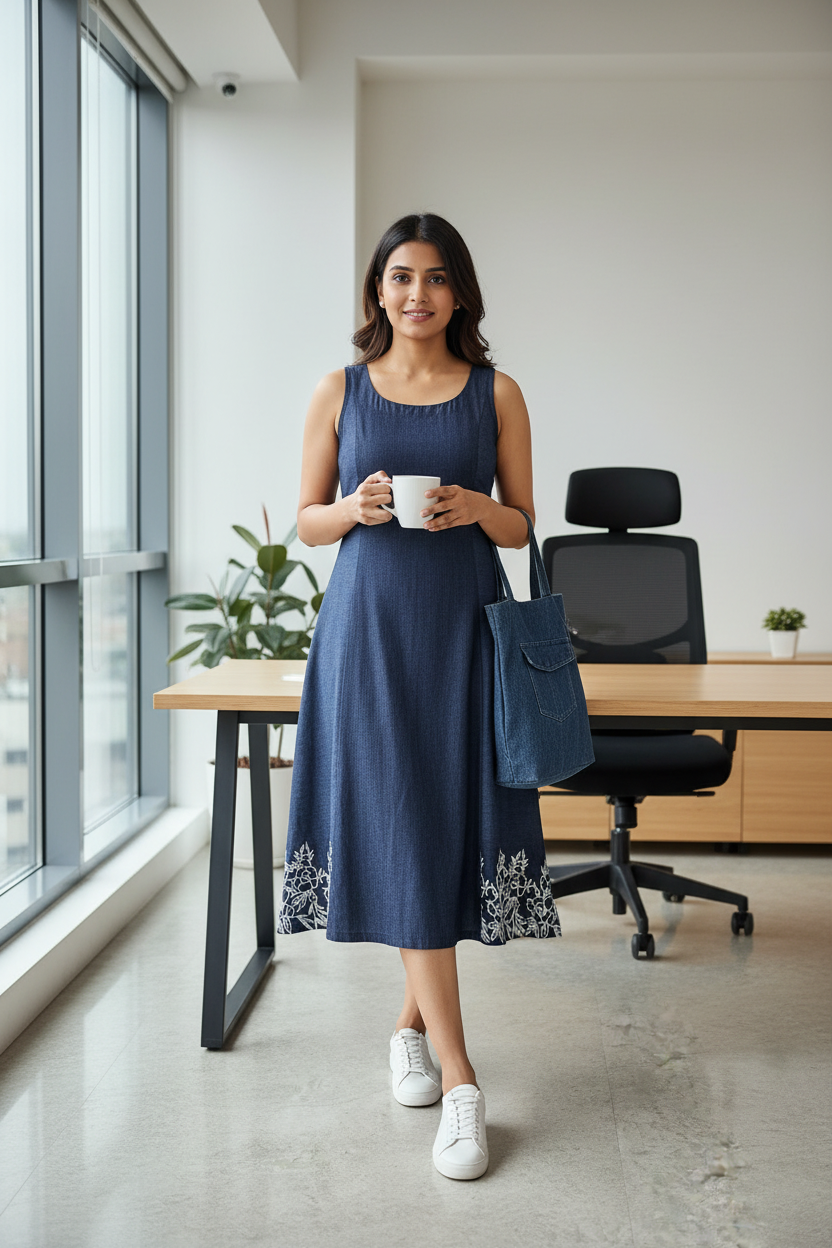 This unique dress is crafted from an innovative Cotton Silk Denim blend, offering the perfect trifecta of comfort, elegance, and durability. The cotton provides a soft, breathable base, while the silk infusion adds a subtle, luxurious sheen and fluid drape that elevates the denim's classic texture. The result is a dress with the familiar structure and color of denim but with a lightweight, supple feel, making it ideal for year-round wear.