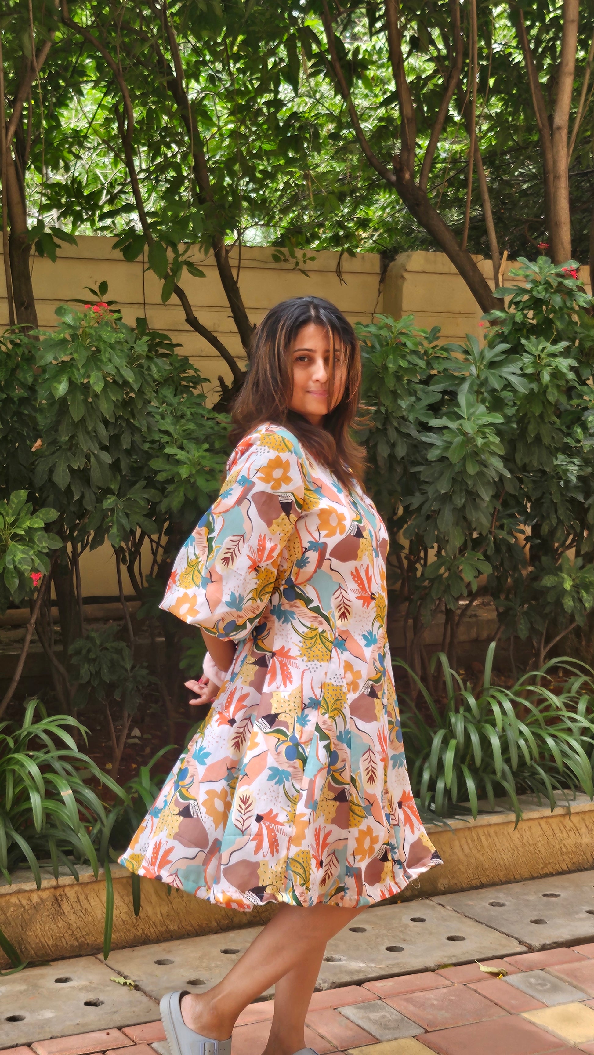 The Flora Flared Dress features a flattering V-neck and elegant balloon sleeves, crafted from breathable mul cotton with a soft lining for comfort. Its midi length and vibrant floral print in turquoise and coral create a fresh, eye-catching look.