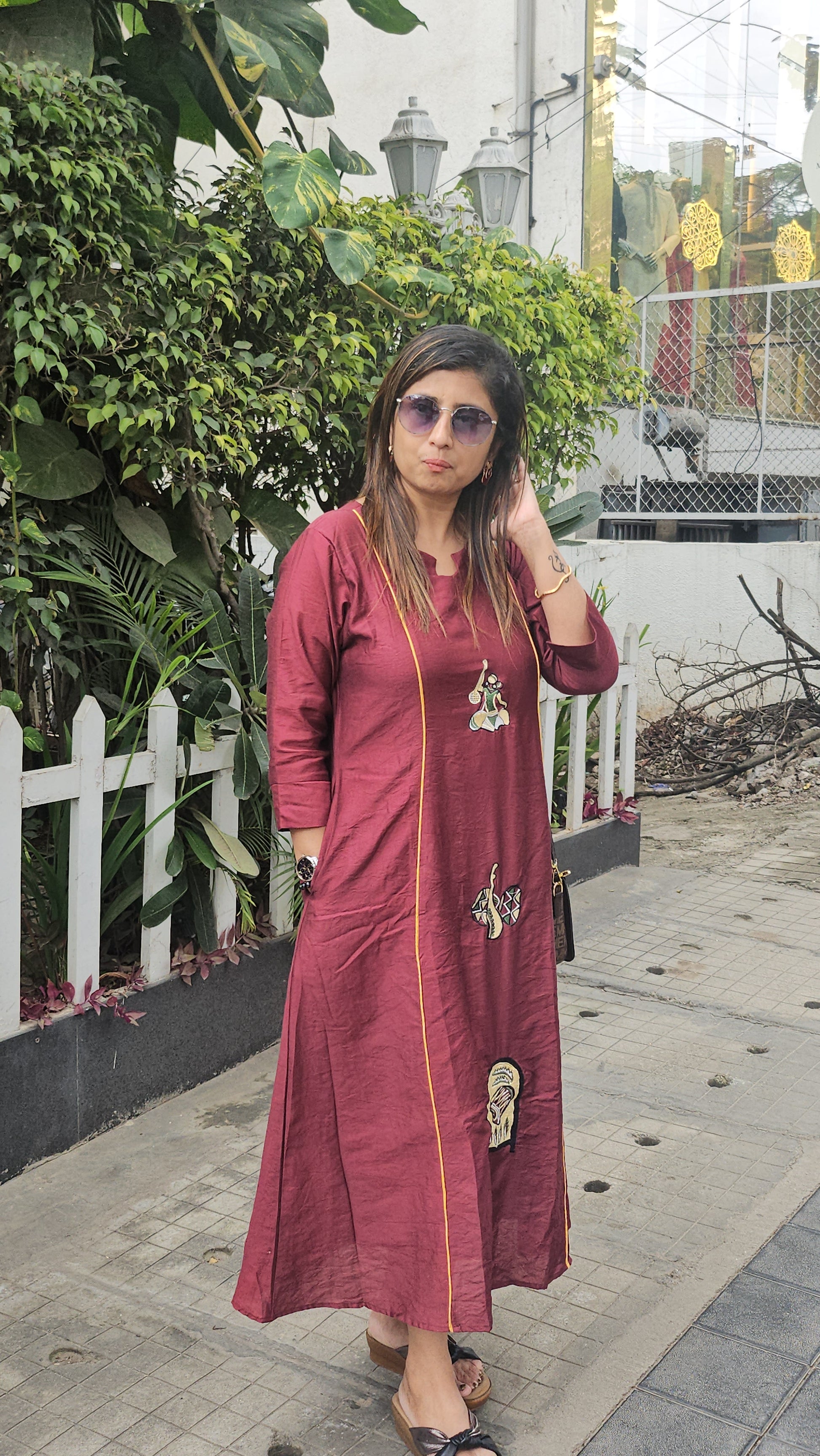 This long Chanderi silk dress features a graceful princess cut that flatters every silhouette. Adorned with delicate embroideries, it embodies timeless elegance and rich craftsmanship. Fully lined for comfort and a smooth drape, this dress is perfect for formal occasions.