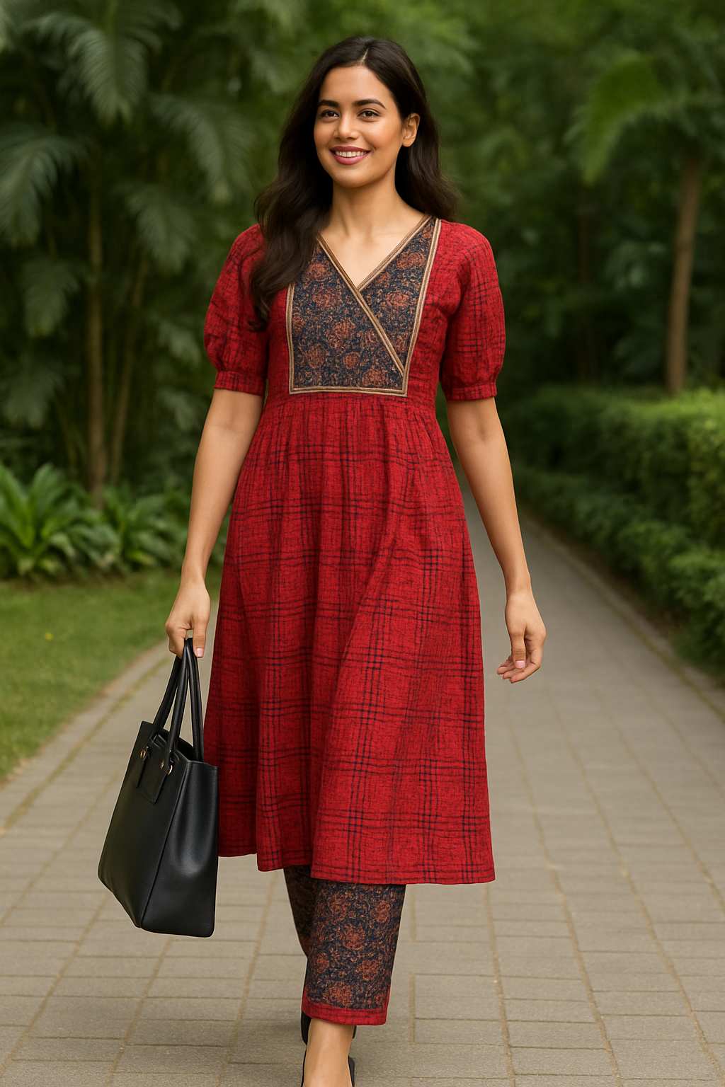 For styling the Kalamkari kurta set, pair it with neutral-toned accessories to let the vibrant red and blue patchwork stand out. Opt for minimalistic jewelry such as silver or oxidized earrings and bangles to complement the traditional design without overwhelming it. Choose comfortable, solid-colored footwear like leather sandals or juttis to maintain an elegant yet casual look. Layer with a lightweight, solid-colored dupatta or shawl in a complementary shade for added sophistication. Keep makeup natural with a focus on warm tones to enhance the kurta’s rich colors.
