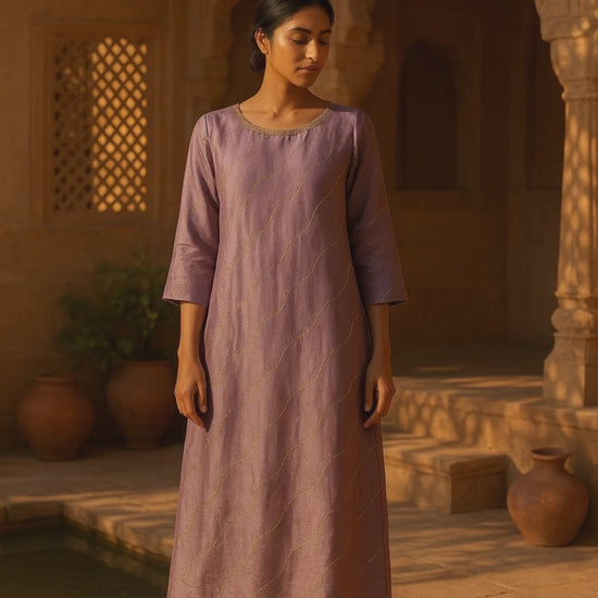 The Lilac Viscose Glow Dress features delicate katdana work artfully embellishing its soft viscose fabric with a subtle zari shine, creating an elegant and lightweight silhouette. Ideal for festive occasions or evening events, this dress combines traditional craftsmanship with contemporary comfort.
