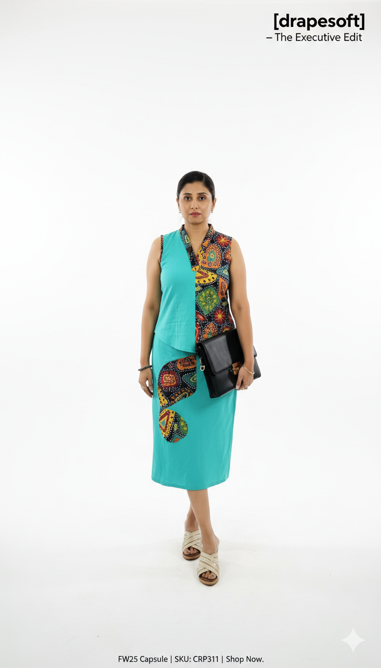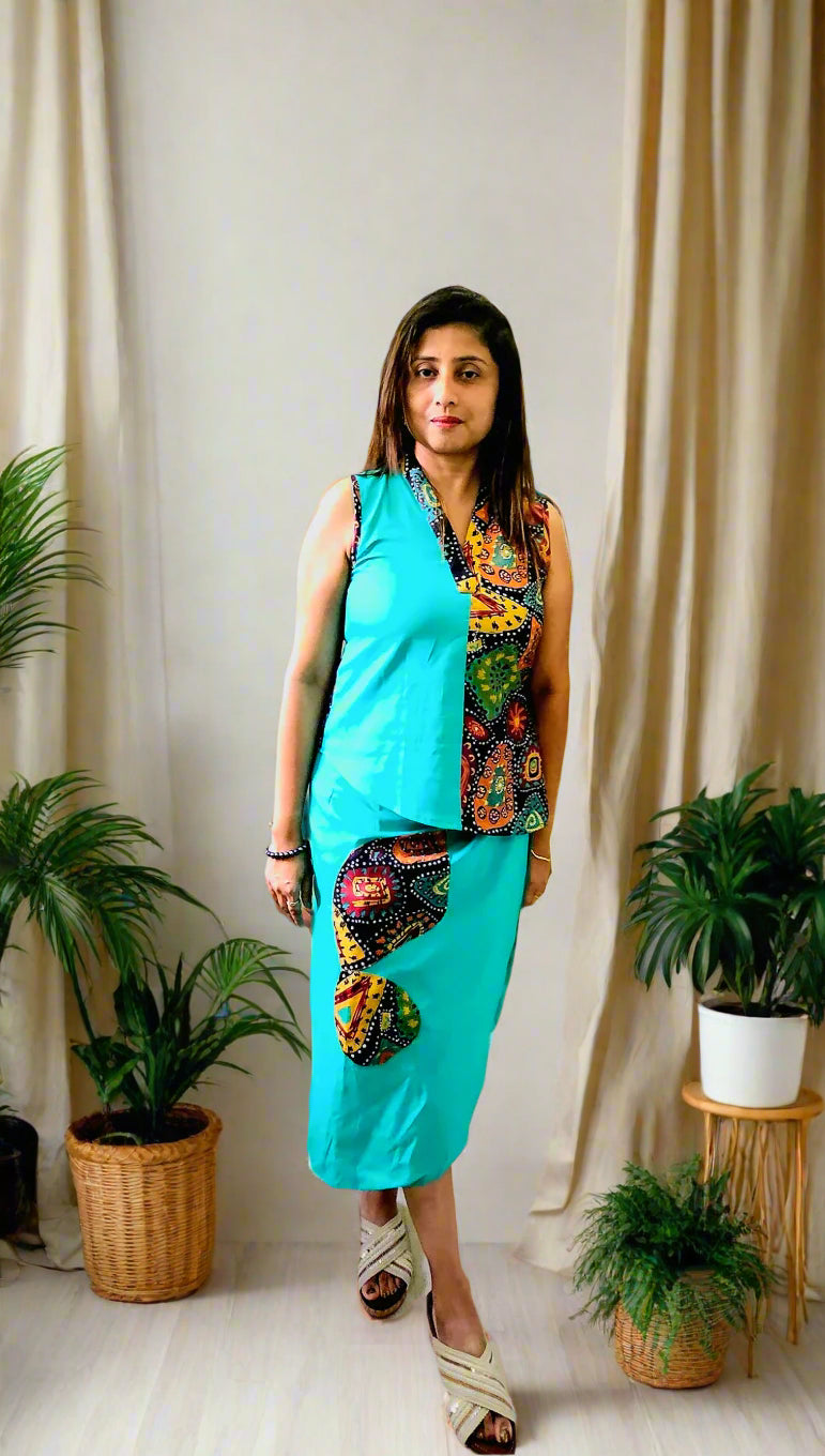 The Mosaic Dreams Co-ord Set features a breathable cotton fabric adorned with a unique mosaic abstract print patchwork, enhanced by stylish attached sleeves for a contemporary flair. The semi-wrapped skirt complements the top with an elegant drape and perfect for both casual and semi-formal occasions. Pair it with minimalist jewelry and neutral-toned footwear to highlight the intricate print.