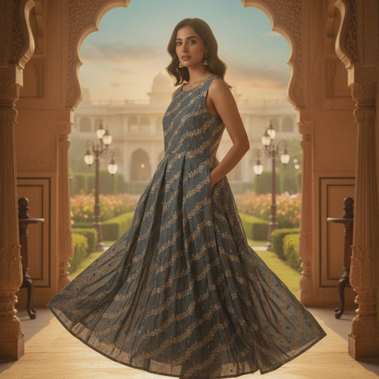 Dola silk fabric offers a luxurious sheen and smooth texture, perfectly complemented by a flattering fit and flare silhouette that enhances your natural shape. This design features inbuilt pockets for convenience and intricate zari work that adds a touch of traditional elegance. A soft lining ensures comfort and a polished finish.